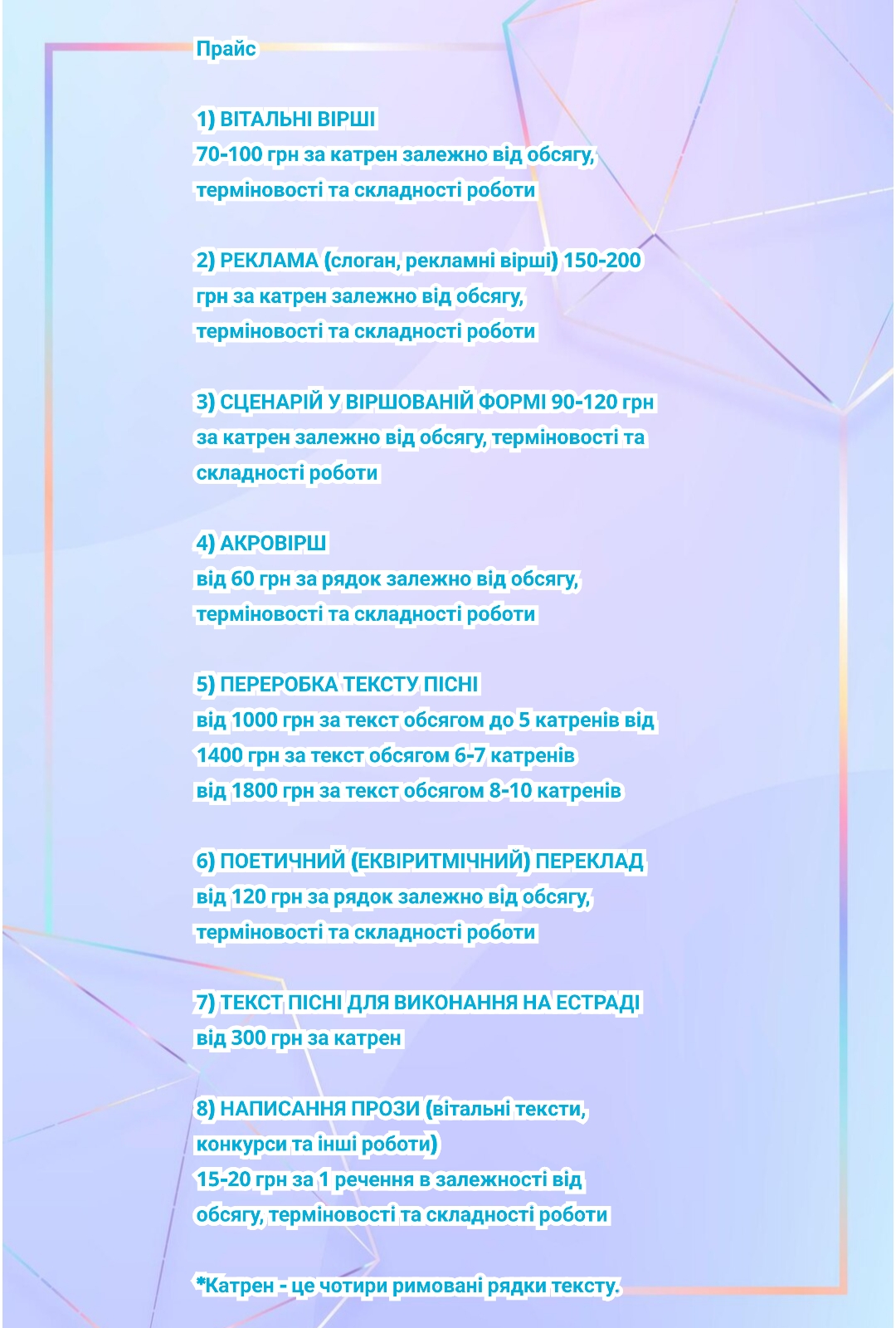 1. Ви заповнюєте коротку форму або пишете мені повідомлення у зручному для вас месенджері чи на email. 2. Я ставлю кілька простих запитань про одержувача: вік, стосунок до вас, важливі риси характеру, спільні спогади, привід. 3. Разом обираємо стиль (ліричний, жартівливий, урочистий тощо) та орієнтовний обсяг вірша. 4. Узгоджуємо терміни написання, вартість і формат: електронний файл, текст для листівки чи макет для друку. 5. Після завдатку або повної оплати(за бажанням замовника) я пишу вірш і надсилаю вам готовий текст у погоджений спосіб.